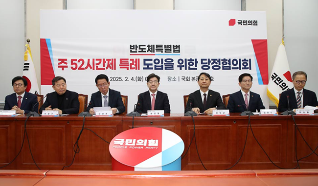 2025년 2월 4일, 당시 김문수 고용노동부 장관은 국민의힘과 함께 서울 여의도 국회에서 열린 반도체특별법 주52시간제 특례 도입을 위한 당정협의회를 열었다. 출처 : 국민의힘