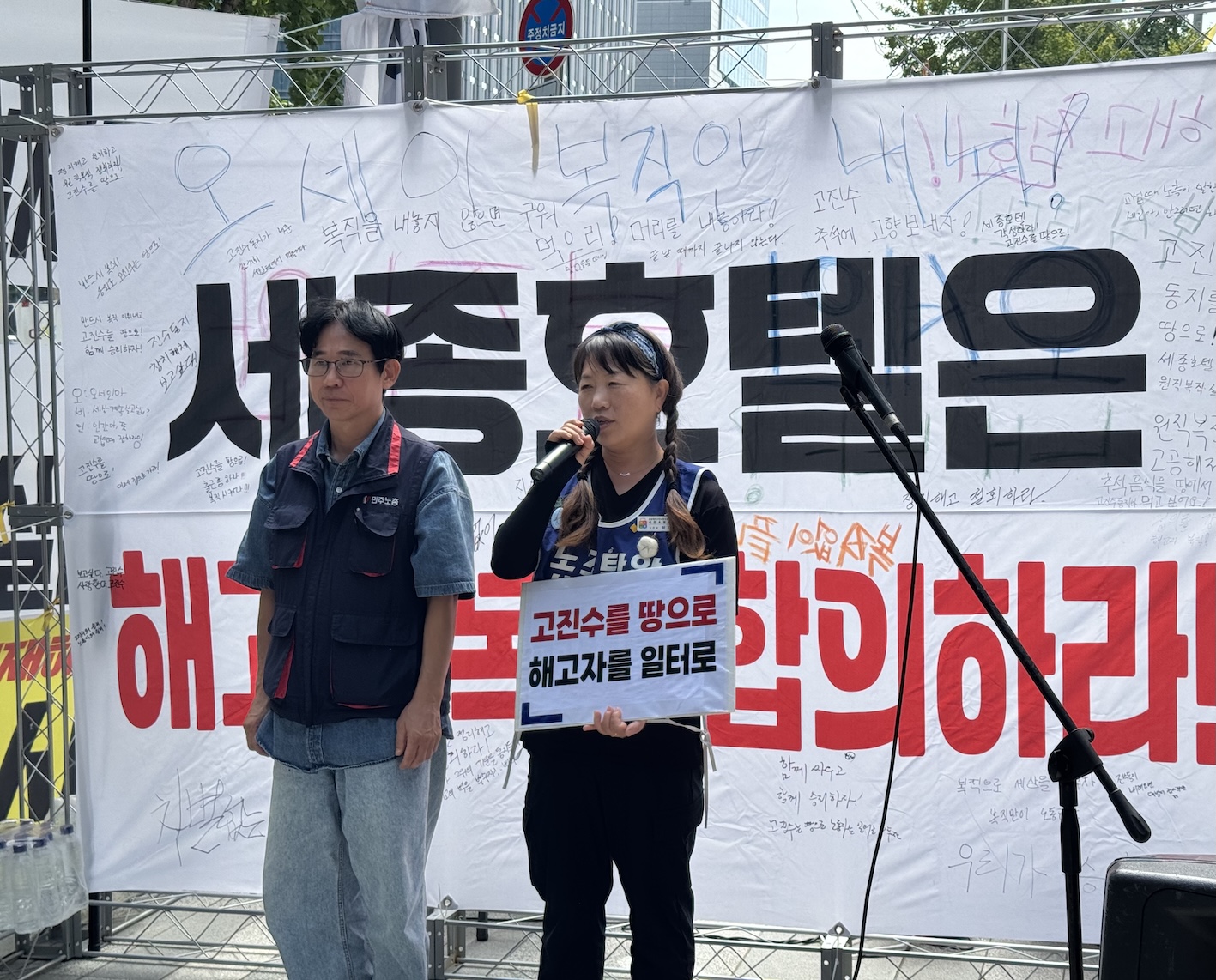 세종호텔 해고노동자로 이날 교섭에 참여했던 허지희 세종호텔지부 사무국장은 2일 오후 교섭장에서 나와 결의대회에 참여한 연대 시민들에게 “긴 추석 명절 연휴 동안 고진수 동지가 홀로 고공에 남아 있지 않도록” 이번 교섭을 통해 합의안을 도출해 보자고 지난 1일부터 2일 오전까지 교섭장을 지키면서 사측을 거듭 설득했으나 쉽지 않았다면서 안타까운 마음을 전했다.