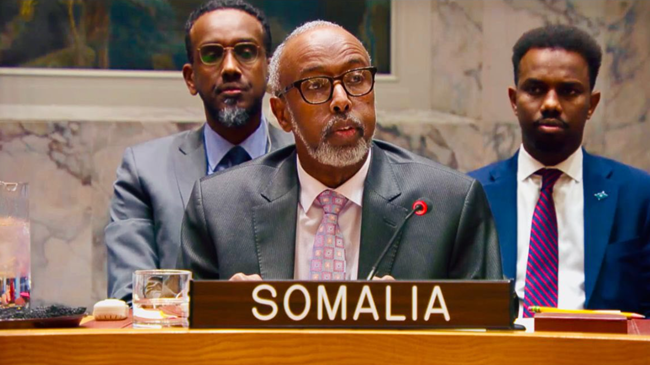 2025년 12월 29일 열린 유엔 안전보장이사회 긴급회의에서 발언하는 소말리아 유엔 대사 아부카르 오스만. 출처: 소말리아 외무부