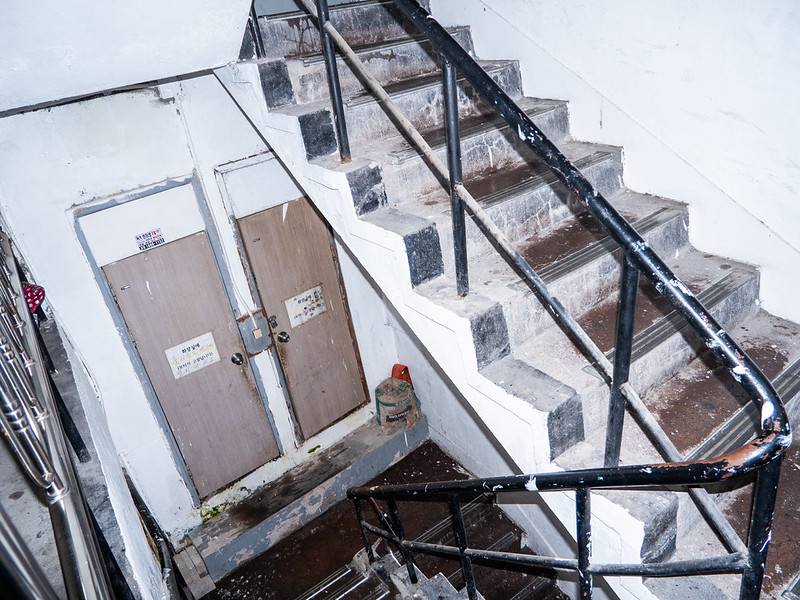 입춘첩을 붙인 쪽방 건물 내부. 새어나온 물에 계단이 모두 젖어 있다. 참세상 박도형 기자.