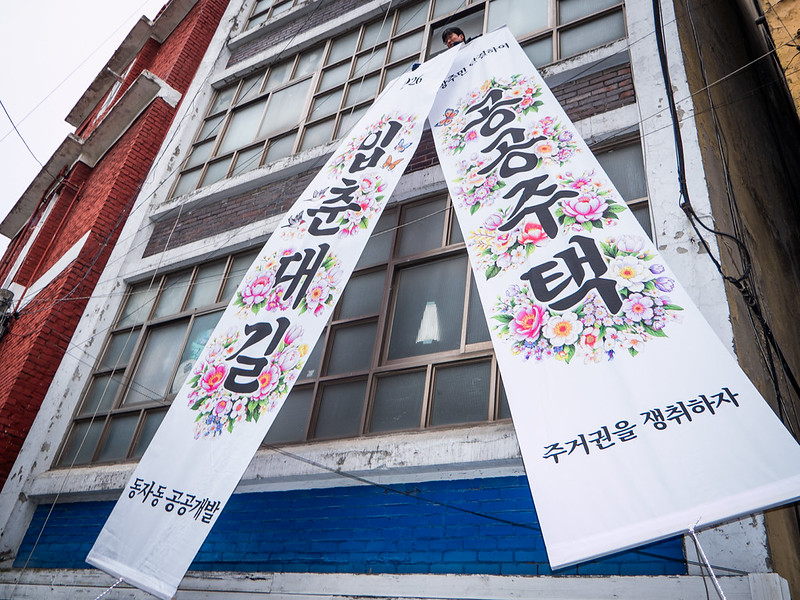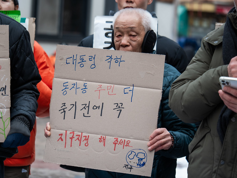 입춘을 맞은 4일 오전, 동자동 쪽방촌에서 주민과 활동가들이 “봄을 부르는 쪽방 주민들의 목소리” 기자회견을 열고 동자동 공공주택사업의 조속한 시행을 촉구했다. 하루 뒤인 5일이면 동자동 공공주택사업 발표 5년을 맞지만, 정부는 아직 사업의 시작 단계인 공공주택지구 지정조차 하지 않은 상태다. 이들은 쪽방에 존재하지 않는 현관문 대신, 건물 전면에 “입춘대길”과 “공공주택”이 적힌 대형 입춘첩을 게시하는 것으로 기자회견을 마무리했다.