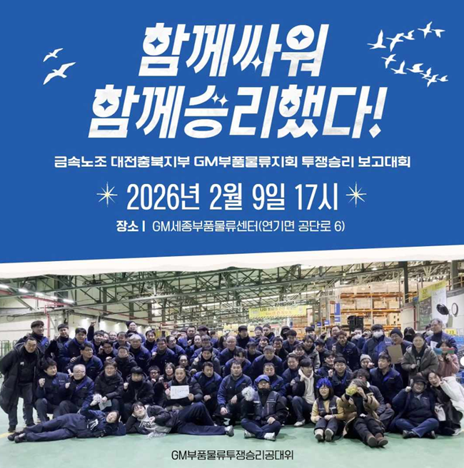 GM부품물류지회와 투쟁승리공동대책위원회는 9일 오후 5시, 한국GM 세종부품물류센터 내수출하장에서 투쟁 승리 보고대회를 열 예정이다. 노조는 “이번 투쟁이 끝이 아니라 출발점”이라고 밝혔다. “고용은 지켜냈지만, 간접고용 구조에서 발생하는 차별과 불안정 문제를 해결해야 할 과제는 여전히 남아 있다”며 남은 과제를 제시했다.