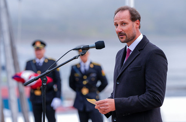 노르웨이의 왕세자 호콘(Haakon)이 2025년 8월 14일 스발바르가 노르웨이 왕국의 일부가 된 지 100주년을 맞아 스발바르를 방문해 스캬링가(Skjarringa) 기념비 앞에서 연설하고 있다.