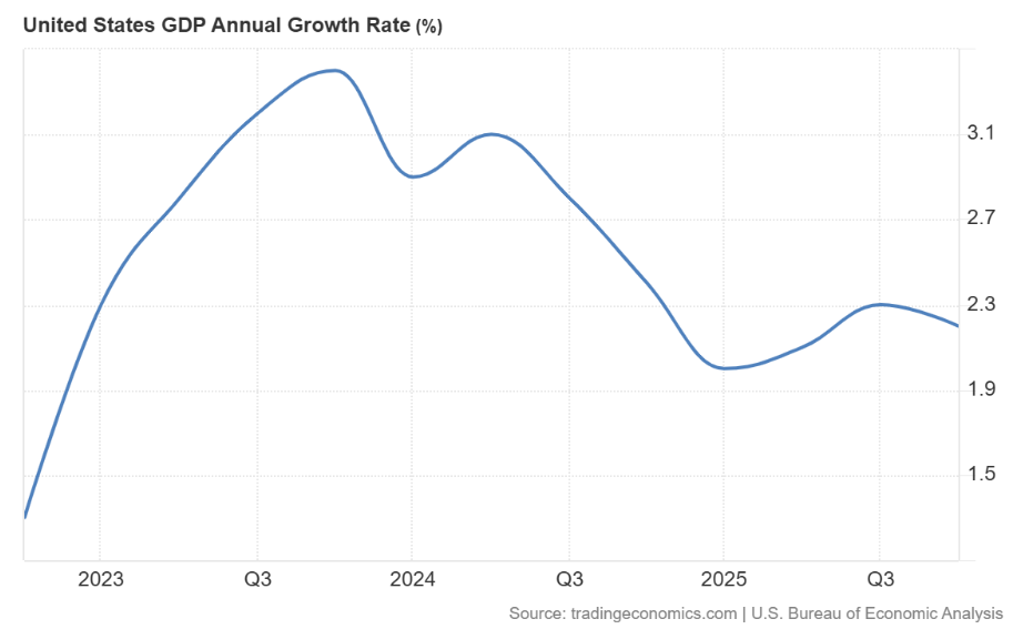 2025년 4분기 미국 경제는 연이율 기준 1.4% 성장하는 데 그쳤으며이는 3%로 예상했던 전망치를 크게 밑도는 수치라고 실질 국내총생산(GDP) 속보치가 보여준다. 2025년 전체로 보면 미국 경제는 2.2% 성장해 2024년의 2.4%보다 낮았다미국 경제가 호황에 들어섰다는 트럼프와 참모들의 자랑은 이번 지표 이후 설득력이 떨어진다. 2025년 설비 및 소프트웨어 제품에 대한 투자는 8% 이상 증가했는데이는 아마도 AI 투자 붐의 결과다이러한 요인이 없었다면 지난해 미국의 실질 GDP 성장률은 2%를 훨씬 밑돌았을 것이다.