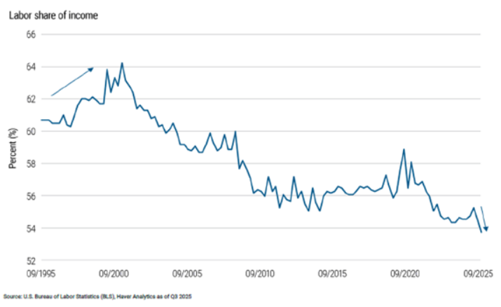 그러나 이번에는 다르다. 2025년 노동자의 실질임금 증가율은 1%를 겨우 웃도는 수준으로 둔화했다이는 미국 국민소득에서 노동이 차지하는 비중을 수십 년 만에 가장 낮은 수준으로 떨어뜨리는 데 기여했다.