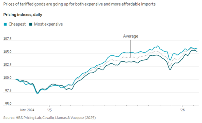 트럼프 행정부는 지난해 4월 이후 인상한 수입 관세(현재 미 연방대법원이 위법으로 판단했다)가 인플레이션에 영향을 주지 않았다고 주장한다그러나 최근 분석은 그렇지 않다고 본다미 의회예산국(CBO)은 미국 기업과 소비자가 인상된 관세의 95%를 부담한다고 추정한다특히 식품 수입 관세는 44% 상승했고이는 사실상 소비자에게 12% 세금을 부과한 셈이다뉴욕 연방준비은행도 관세 대상 상품의 수입가격이 11% 상승했다며 “2025년 부과한 고율 관세의 부담을 미국 기업과 소비자가 대부분 떠안는다고 밝혔다높은 관세와 인건비건강보험 비용 상승이 기업의 가격 인상을 부추겼다. “수개월간 가격을 동결하던 기업들이 한 자릿수 후반대 인상에 나섰다.”