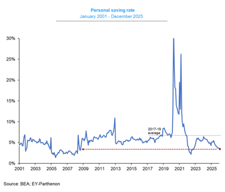 미국인들은 소비를 유지하려고 저축을 줄이고 부채를 늘렸다개인저축률은 12월 소득의 3.6%로 떨어졌고, 2025년 4월 이후 1.9%포인트 하락했다.