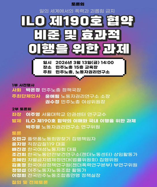 이번 토론회는 정부가 2025년 10월 국정과제를 통해 ILO 제190호 협약 비준 추진을 밝힌 이후, 협약 비준을 앞두고 필요한 국내 법·제도 개선 과제를 점검하기 위해 기획됐다. 노동계와 시민사회는 협약의 주요 내용과 국내 법제도 현황을 검토하고 협약 이행을 위한 정책 방향을 논의할 예정이다.