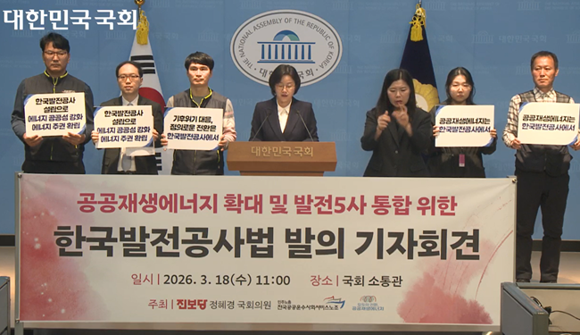 정혜경 진보당 의원은 18일 국회 소통관에서 기자회견을 열고 발전5사를 통합하는 내용을 담은 한국발전공사법을 발의했다고 밝혔다. 이날 기자회견은 공공운수노조, 발전노조, 공공재생에너지연대 등 노동·시민사회 단체가 함께 참여해 법안 취지와 필요성을 강조했다.