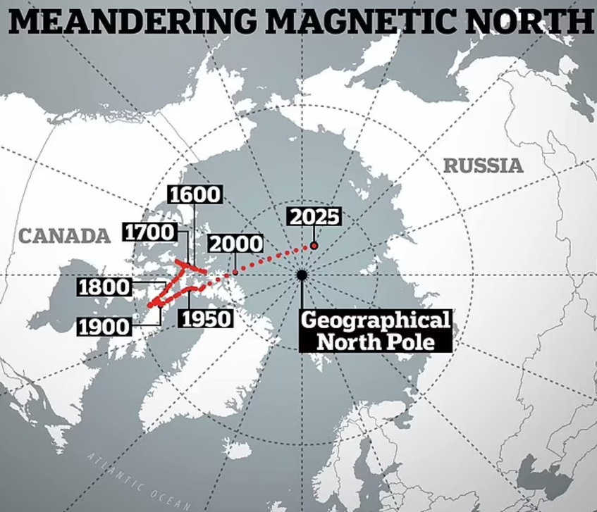 시간이 지남에 따라 자기 북극이 지리적 북극과 관련하여 어떻게 변동했는지를 보여주는 그래픽