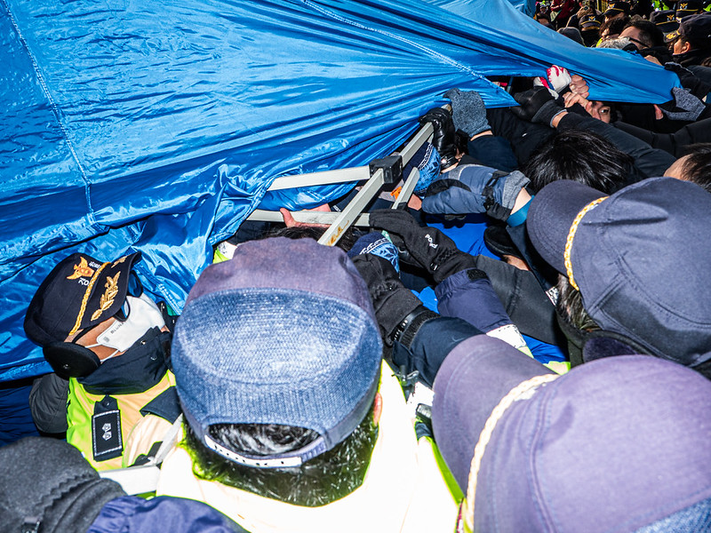 26일 오후, ‘동자동 쪽방 공공주택 촉구 청와대 영정 행진’을 마무리한 참여자들이 청와대 앞에 농성장을 설치했으나 경찰에 의해 철거되었다.