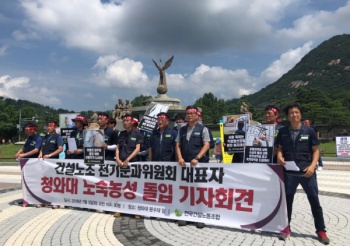 건설노조 전기분과위원회 대표자들이 3일 오전 청와대 분수대 앞에서 ‘직접활선 완전 폐지, 산업통상자원부가 나서라’ 기자회견을 열고 그 자리에서 ...