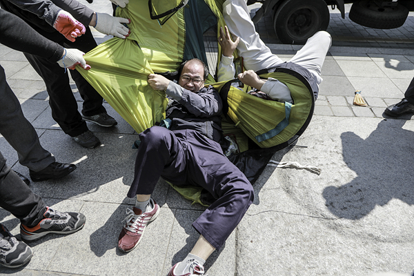 경찰 약 200명, 종로구청 직원 15명이 6일 오후 2시경 비정규직 노동자들을 제압하고 농성장을 철거했다. 기아자동차비정규직지회 김수억 지회장...