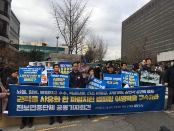 진보민중단체들이 이명박 전 대통령의 구속을 촉구하는 긴급 기자회견을 진행했다. 민주노총을 비롯한 16개 진보민중단체는 14일 오전 9시 법원 삼...