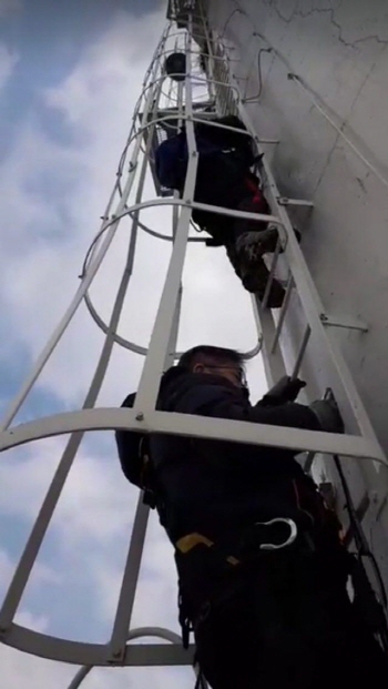 의사들이 64일째 75m 굴뚝에서 농성 중인 금속노조 파인텍지회 홍기탁, 박준호 조합원의 건강을 진단하기 위해 굴뚝을 올랐다. 의사들은 조합원들...