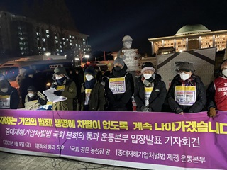 산재 유가족 및 노동계의 요구에서 대폭 축소된 중대재해기업처벌법이 8일 국회 본회의를 통과하면서 정부와 정치권을 향한 비판의 목소리가 커지고 있...