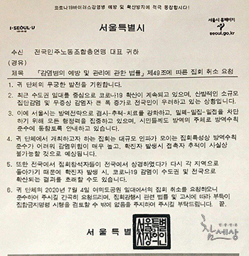 서울시는 “7월 4일 여의도 공원 일대에서 집회 취소를 요청한다. 집회 강행 시 집함금지명령 시행을 검토할 수밖에 없다”고 밝혔다. 비정규직 노...
