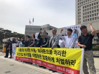 금속노조 유성기업지회는 8일 오후 서울 서초구 대법원 앞에서 기자회견을 열고 “노동 3권을 파괴한 비용을 회삿돈으로 처리한 유성기업 유시영을 대...