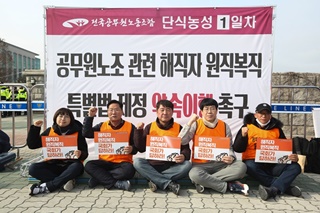 김은환 회복투 위원장이 해직공무원의 원직복직 약속 이행을 요구하며 단식에 돌입했다. 공무원노조는 19일 오후 2시 국회 앞에서 단식농성 돌입 기...