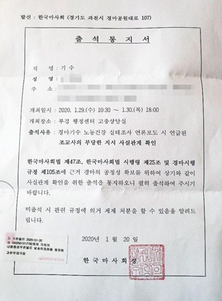 고 문중원 기수 사망 사건으로 논란을 빚고 있는 한국마사회가 노조 설문에 참여한 경마기수들을 상대로 출석통지서를 보내 반발이 일고 있다. 마사회...