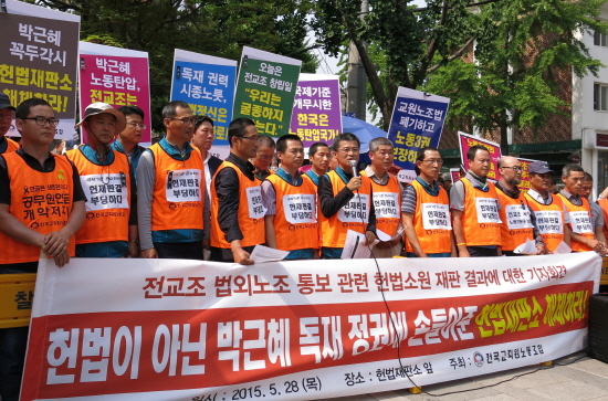 전교조는 교원의 단결권을 제대로 보장하지 않는 헌법재판소의 교원노조법 2조 ‘합헌’ 결정이 정부의 전교조 탄압 연장선상에 있음을 지적하며 교원노...