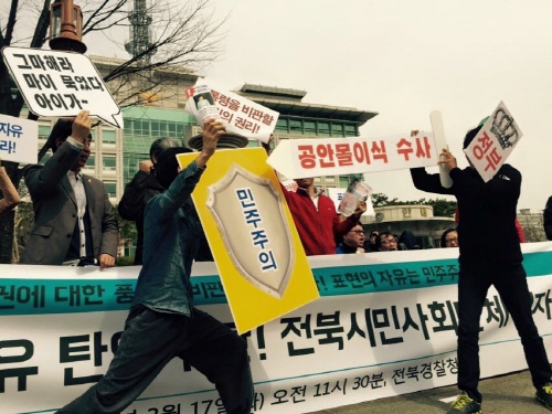 경찰이 단지 박근혜 정권을 비판한 전단지를 뿌렸다는 이유만으로 압수수색을 벌이는 등 과잉 수사 논란이 일고 있는 가운데, 전북지역 시민사회단체들...