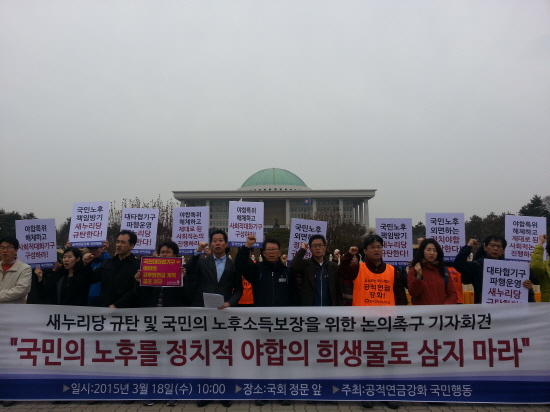 전국의 302개 시민, 사회단체가 뭉친 ‘공적연금 강화 국민행동’(연금행동)이 발족한 지 1주일 만에 행동에 나섰다. 공무원연금 개악만을 밀어붙...