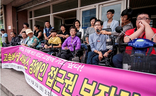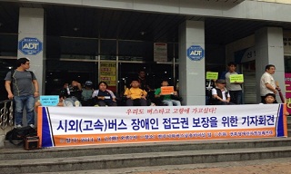 울산장애인철폐연대는 2일 오후 고속버스 터미널 앞에서 회견을 열어 고속버스와 시외버스에 장애인 접근권을 보장하라고 요구했다.
