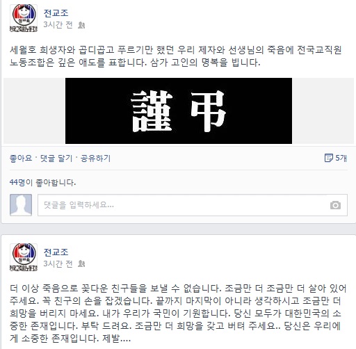 전교조는 16일 오후 11시59분 경 발표한 긴급 성명에서 “실종된 290여명의 탑승객의 구조가 쉽지 않다는 너무나 비통한 소식이 전해지고 있다...