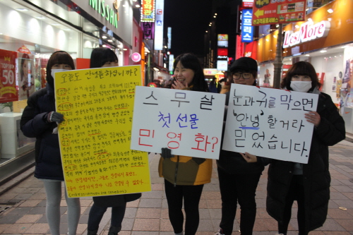 친구는 깨알 같은 글씨가 적힌 피켓을 들고 있었고, 다른 친구들은 그 주위에서 지나는 사람들을 바라보고 있었다. 좀 더 가까이 가보니 다른 2명...
