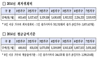 2014년도 최저생계비가 4인 가구 기준 163만 820원(현금급여 131만 9089원)으로 확정됐다. 이는 올해 4인 가구 기준 현금급여 12...
