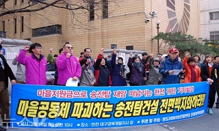 한국전력이 경북 청도군 345kv 송전탑 건설에 반대하는 주민의 의견 수렴 없이 찬성하는 주민에게 ‘마을발전기금’을 지급해 마을공동체를 분열시킨...