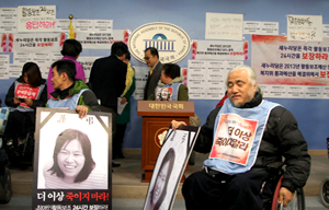 지난 2일 오후 2013년 중증장애인 24시간 활동보조 지원 예산 확보를 위해 이한구 새누리당 원내대표 면담을 요구하며 국회 기자회견장(정론관)...