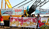 제주 해군기지 구럼비 바위 발파 계획에 제동이 걸렸음에도 불구하고 강정마을 앞 바다 준설작업에 투입될 바지선이 출항 준비 중인 모습이 포착되자 ...