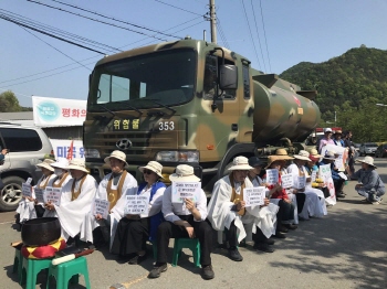 성주 소성리 주민, 종교인들이 사드 부지로 들어오는 유류차량을 막아냈다. 군은 23일 오전 11시경 성주 소성리에 위치한 사드 부지로 유류차량 ...