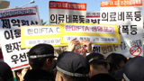 노동, 보건의료단체들은 12일 2시 협상 시작에 앞서 오후 1시 하얏트 호텔 입구에서 '협상 반대' 기자회견을 가졌다. 노동, 보건의료단체들은 ...