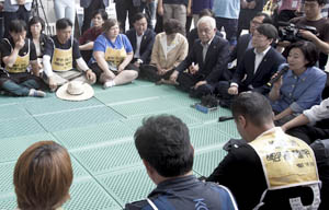 세월호 특별법이 새누리당의 반대로 통과가 불투명해지면서 야당 대표들이 16일 오전 세월호 가족대책위 국회 농성장을 찾았다. 한 세월호 유가족은 ...