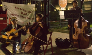 음악이 무기를 포위했다. 3일 독일 오케스트라 그룹 ‘레벤스라우테(Lebenslaute, 삶을 외쳐라)’가 무기제조사 ‘헤클러&코흐(Heckle...