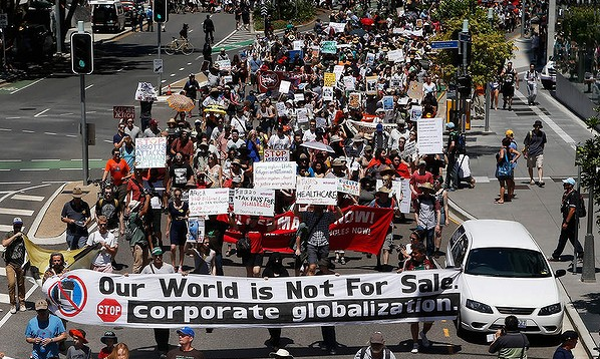 호주 브리즈번에서 열린 G20 정상회의에 맞서 2000여 명이 ‘민중의 행진’을 벌이고 “우리의 세계는 상품이 아니”라고 선언했다.
