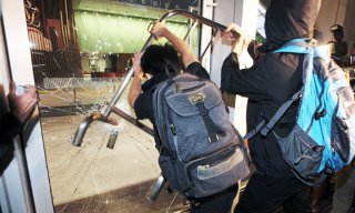 8주째 대중 시위가 계속되는 홍콩에서 시위대 일부가 19일 새벽 애드미럴티에 있는 입법회(의회) 입구 유리문을 철책 등으로 파괴하고 건물에 일시...
