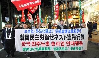 1월 13일 저녁 일본 토교 시부야에서 도로치바(국철치바동력차노동조합) 조합원을 비롯해 노조교류센터 350여명 노동자들이 모여 ‘민주노총 총파업...