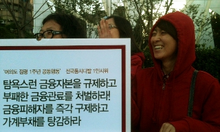 여의도 점령 1주년을 계기로 금융자본 규제와 부패한 금융관료 처벌을 요구하는 시위가 진행됐다. 이날 시위에서는 부당한 이유로 쌍용자동차 경영진 ...