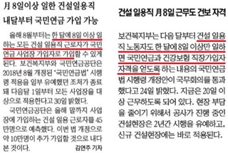 오른쪽 세계일보 기사처럼 애초 건설일용직은 2018년 8월 1일부터 한 달에 8일 이상만 일하면 국민연금과 건강보험에 직장가입자 자격을 얻어야 ...