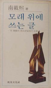 <모래 위에 쓰는 글>은 구역질 나는 유신 찬양 글 모음집이다. 이 책의 추천사를 쓴 최상룡 당시 중앙대 교수는 "남재희는 유신정치가...