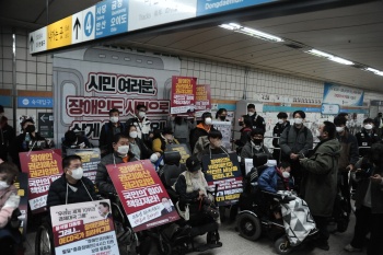 전국장애인차별철폐연대(전장연)가 정부와 국민의힘에 장애인권리예산 보장을 촉구하며 21일 오후 삼각지역 승강장에서 천막농성에 돌입했다. 전장연은 ...