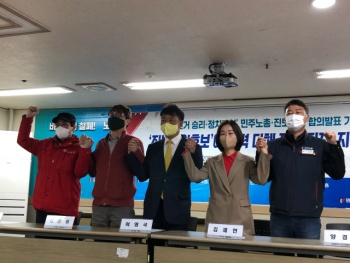 민주노총은 7일 오전 11시 서울 중구 민주노총 중회의실에서 기자회견을 열고 지방선거 관련 대선공동대응기구가 합의한 내용을 발표했다. 이들은 합...