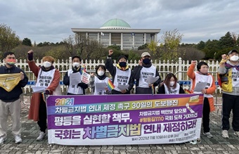 차별금지법 연내 제정을 촉구하는 행진단이 30일 만에 국회 앞에 도착했다. 이날 국회 인근에 모인 300여명의 사람들은 “(차별금지법 국민동의청...