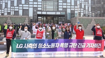 10일 LG트윈타워 노동자가 사측과 몸싸움 중 갈비뼈가 골절된 사건이 발생한 가운데, 노조 및 시민사회단체가 조합원에 대한 폭행이라며 이를 규탄...