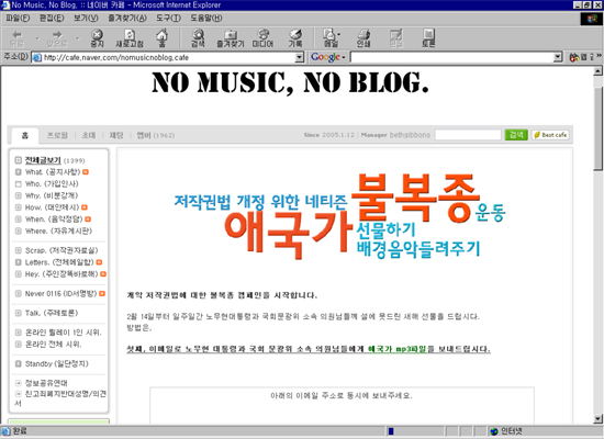 (가칭)저작권법 개정을 위한 네티즌 연대모임, 오늘 오전 저작권법에 대한 네티즌의 입장이라는 공동성명서를 발표하고, 대통령에게 애국가 보내기 등...