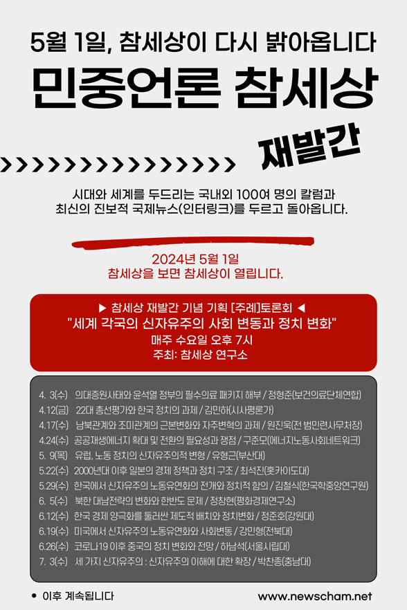 이에 민중언론 <참세상>은 우리 사회의 진보적 담론을 만들고 이끌어 가기 위해 국내 필진 80여 명과 해외 필진 20여 명을 구성해 담론 생성에 주력하려 합니다.